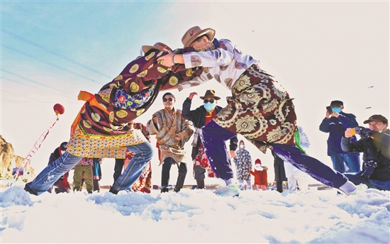 1月7日,甘肃张掖肃南裕固族自治县,在祁丰藏族乡冰雪运动场上,藏族群众在进行雪地摔跤比赛。