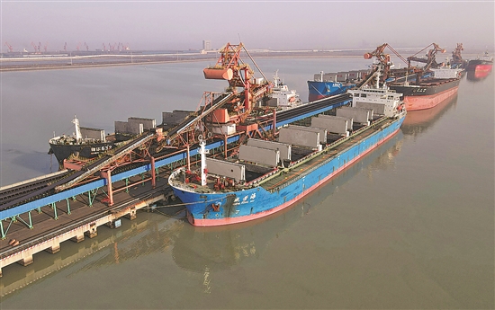 1月8日,船舶在黄骅港码头装运煤炭(无人机照片)。