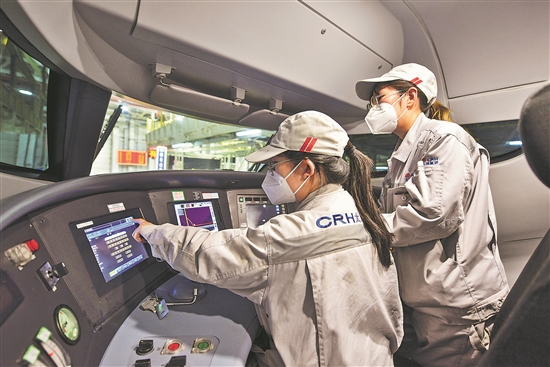1月6日,中国铁路太原局集团公司太原车辆段动车组运用所的两名00后地勤机械师乔小波(左)和李茹对将于春运首日开行的首趟动车组司机室进行制动实验和数据采集作业。今年春运,该段有27名00后独立顶岗作业。张炯 张晋彤 摄