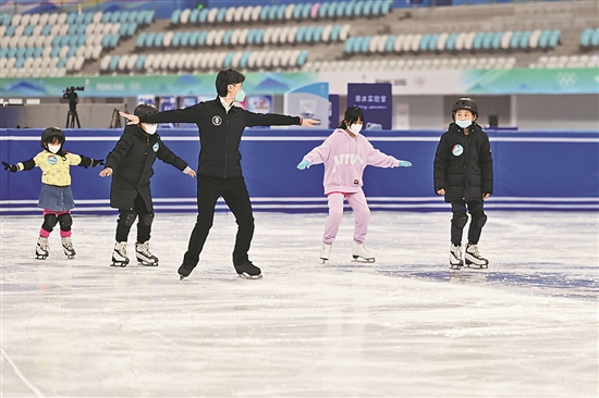 近日,“2022-2023北京冰雪运动消费季”启动仪式在国家速滑馆举行。图为花样滑冰世界冠军佟健(中)在“冠军公益课”上指导小朋友。本报记者 朱亚男 摄
