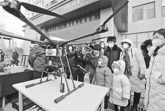 1月9日,在山东省临沂市沂南县公安局举行的警营开放日活动上,民警向市民介绍警用无人机。当日,为迎接第三个中国人民警察节,山东省临沂市沂南县公安局举行警营开放日活动,邀请市民走进警营参观互动,活动包括警用装备展示、缉毒犬查缉表演、安全知识宣传等。