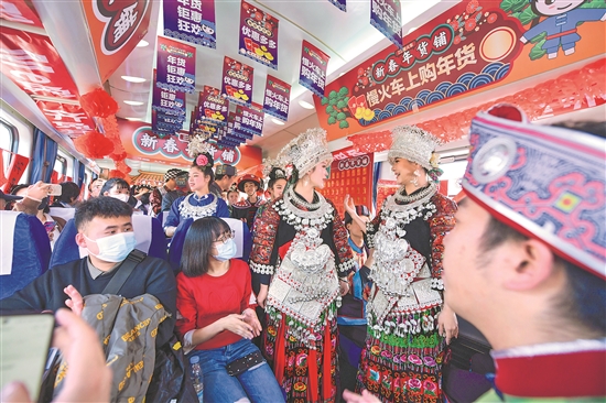 2019年以来,中国铁路成都局集团有限公司贵阳客运段上海二队为方便沿途少数民族地区群众置办年货,每年春运伊始到除夕前,均会视近期客流情况,决定是否在这趟列车上开设新春年货铺,平价销售年货。