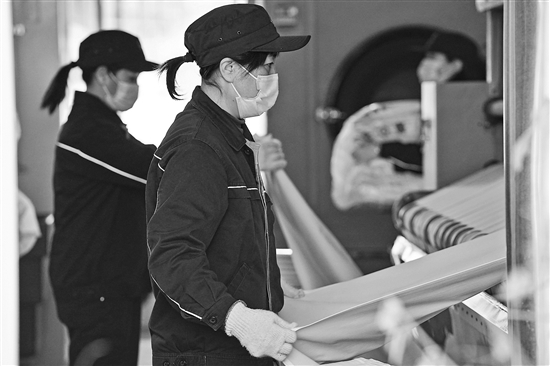 1月11日,在中国铁路上海局有限公司合肥客运段洗涤厂,工作人员将熨烫过的床单叠放整齐。