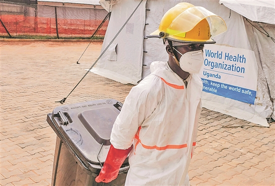 乌干达政府1月11日宣布,去年9月在该国中部暴发的新一轮埃博拉疫情已经结束。世卫组织当天也发表声明,确认乌干达新一轮埃博拉疫情结束。这轮疫情共有140多例确诊病例,其中50多例死亡。图为在乌干达中部地区穆本德,一名清洁工人拖着垃圾箱走在埃博拉治疗中心内。新华社发(哈贾拉 摄)