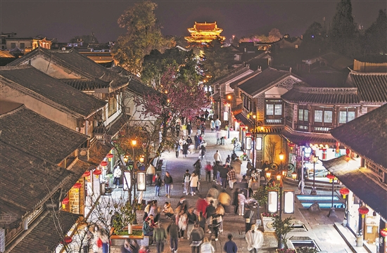1月13日,在云南大理古城,街道热闹非凡,不少游客在夜晚打卡古城,体验夜古城的氛围。《工人日报》记者日前在大理古城走访发现,人民路上,商家吆喝着接待客人,游客驻足欣赏商家推出的才艺表演,摩肩接踵的行人来来往往。
