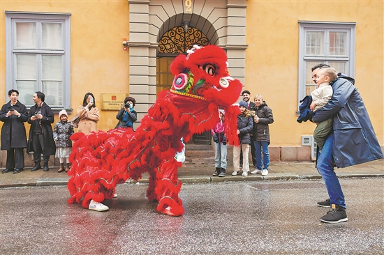 当地时间1月14日,人们在瑞典斯德哥尔摩中国文化中心外观看舞狮。一场融合中瑞文化元素的新春演出14日在瑞典斯德哥尔摩中国文化中心举办,拉开2023年瑞典“欢乐春节”活动的帷幕。新华社发(魏学超 摄)