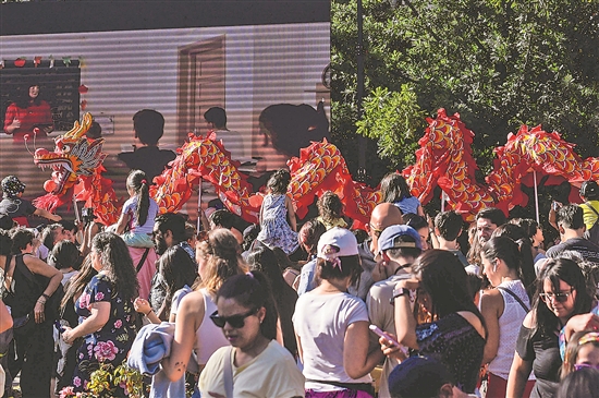 当地时间1月14日,在智利首都圣地亚哥,人们观看舞龙表演。智利首都圣地亚哥14日举行盛大春节庆祝活动,为当地民众奉上文艺表演、传统文化体验等精彩节目。