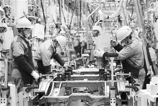 1月14日,在北京汽车制造厂青岛总部基地的生产车间,一片繁忙景象,工人在进行焊接作业,开足马力赶订单。