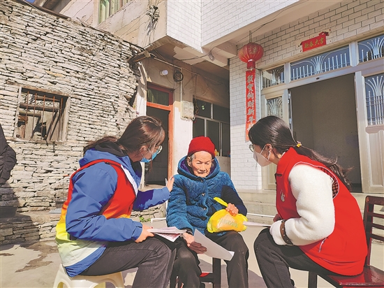 图为综合服务队队员入户向80岁以上老人发放医药健康包,并讲解新型冠状病毒疫情日常防护知识。