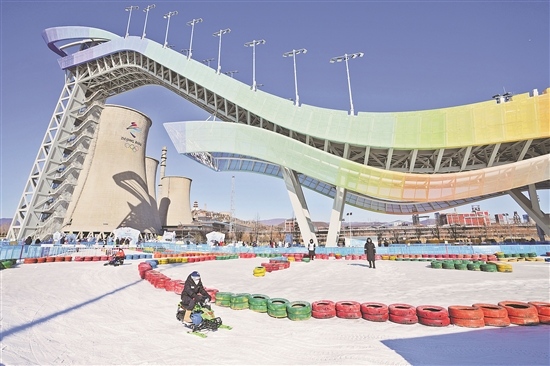 2023年元旦开启的“首钢园冰雪汇”,让北京首钢滑雪大跳台成为大众冰雪乐园。图为近日游客在首钢滑雪大跳台下体验雪地越野。