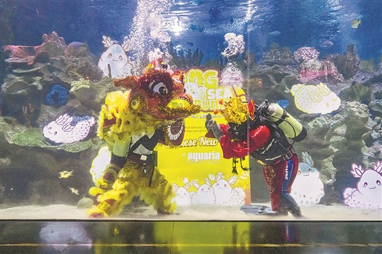当地时间1月18日,潜水员在马来西亚吉隆坡城中城水族馆进行水中舞狮和“财神”拜年表演。城中城水族馆将在春节期间推出水中舞狮表演和“财神”拜年在内的多种贺新年活动,庆贺农历新年的到来。新华社记者 朱炜 摄