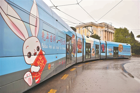 当地时间1月17日,兔年春节主题电车亮相意大利首都罗马,庆祝即将到来的中国农历新年。新华社记者 金马梦妮 摄
