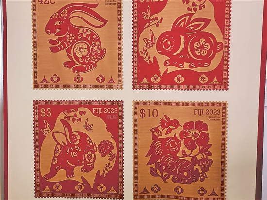 这是1月18日在斐济首都苏瓦的斐济中国文化中心拍摄的中国农历兔年生肖邮票,本套兔年生肖邮票共4枚,设计创意来源于中国剪纸。