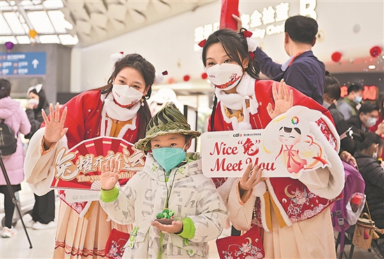 1月19日,在海口美兰国际机场出发大厅,小朋友和工作人员合影留念。