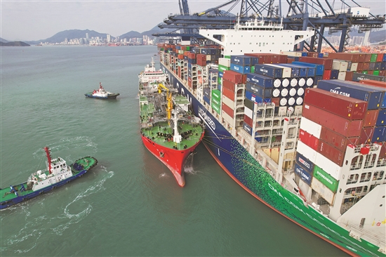 1月18日,在深圳盐田港海域,全球最大LNG运输加注船“海油石油301”通过“船对船”成功为全球最大型的双燃料动力集装箱船“达飞协和号”加注6000立方米LNG燃料。