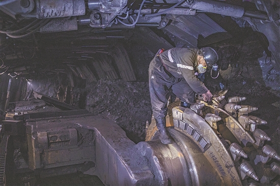 1月11日晚,在塔山煤矿的工作面上,检修工正在为一套智能化割煤机更换机组截齿。