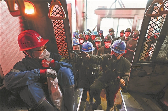 1月16日,在塔山煤矿的入井口,综采队的工人正排队上车前往工作面。从这里到达地下400米的下车点需要40分钟左右,之后还要再步行一段才能到达工作面。