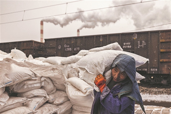 1月13日,山西大同。大秦铁路的一处转运站上,搬运工正在搬运铁路煤炭运输防冻剂。在寒冬,防冻剂可以防止火车皮和煤炭冻结在一起,确保顺利卸车,提高运输效率。