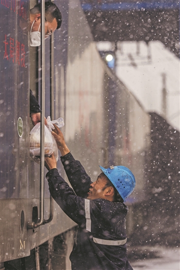 1月13日,山西大同迎来新年首场降雪。在大秦铁路的一处转运站上,一名工人为等待装煤的火车司机递上热腾腾的饭菜。由于装货期间每装满一节车皮,火车都要移动,司机不便下车,每到一个站点,地面工作人员都会为他们准备好饭菜。