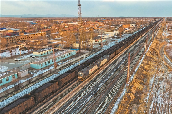 1月17日,山西大同云州区,在中国铁路太原局大同工务段检修线路后,2.1万吨煤运重载列车行驶在大秦线上。在这条煤运专线上,保供期间每天开行的重载列车达到90多对。