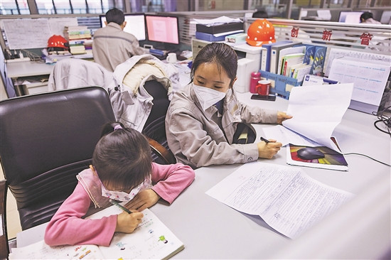 1月13日,在大同一家能源企业的办公室内,张颖利用工休时间查看女儿的作业。寒假期间正值保供任务的紧张时刻,为了不耽误工作,她把孩子带到办公室方便照看。