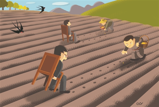 能够关心农民,固然是好事,能够亲临第一线“帮扶”农民,更该鼓励。只是有一句话不得不说,如果身段儿再放低一些就完美了。希望这幅漫画,对这些实施“帮扶”的同志们,也是一项“帮扶”措施。
