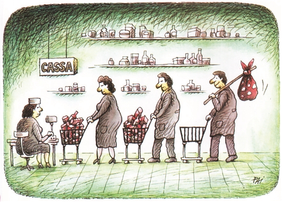 人们在超市习惯推着购物车选择商品并结账。可是这位先生为啥挑着包袱来付款?原来他是旅行家——算是职业习惯吧。