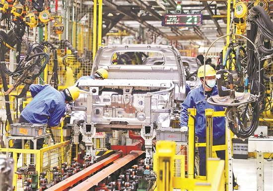 1月28日,工人在上汽通用五菱青岛分公司的生产车间进行焊接作业。