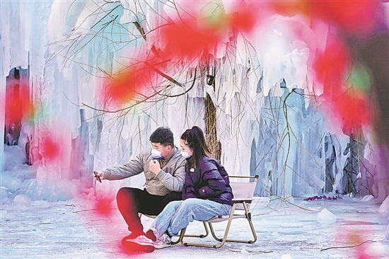 1月27日,游客在太行山深处的河北省邢台市天河山景区冰雪游乐区内拍照留念。