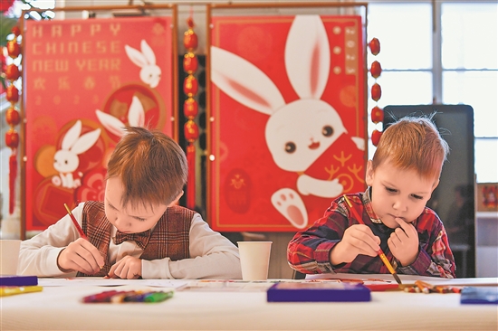 当地时间1月28日,孩子们在俄罗斯莫斯科举办的“欢乐春节”活动上画画。当日,莫斯科市郊的中共六大会址常设展览馆举办“欢乐春节”活动,人们参与剪纸、绘画、茶艺、雕版印刷等多种体验项目,共庆欢乐中国年。新华社记者 曹阳 摄