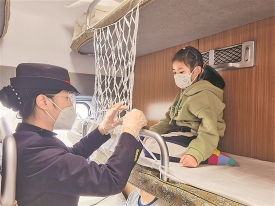 近日,南昌客运段“井冈山号”列车一位客运员正为使用卧铺的儿童旅客安装安全网。春运以来,该列车推出系列爱心服务举措,其中包括为保障儿童旅客出行安全而推出的爱心安全网。工作人员将安全网绑定在中上铺护栏的两端,保护儿童安全的同时不影响同行成人旅客照顾随行儿童。本报通讯员 李媛 何云斯 摄