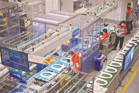 1月31日,工人们在泉州市南安市九牧智能马桶工厂内安装智能座圈组件。