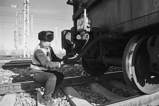 2月1日,呼和浩特南站的工作人员在安装列尾装置。
