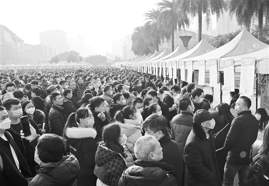 1月29日,招聘会现场人头攒动,众多求职者咨询意向岗位的详细信息,踊跃登记应聘。