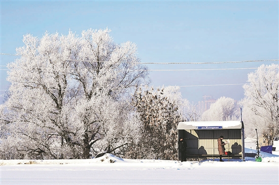 当地时间2月1日,俄罗斯新西伯利亚,树木被冰霜覆盖。图为人们在雾凇美景中等车。视觉中国 供图