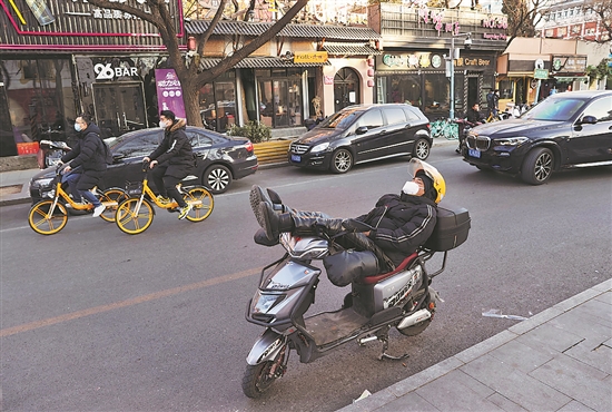 1月31日,在北京朝阳区三里屯附近,一名外卖小哥躺在电动车上打盹儿,不仅挤压车道,其安全隐患更让人担忧。一些小哥表示,虽然附近商场也有室内休息场所,但不太方便,非机动车辆停车区被各类共享单车占满,也是停在路边休息的原因。本报记者 吴凡 摄