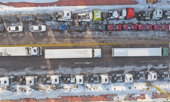 来自哈萨克斯坦的货车、即将出口的车辆在新疆巴克图口岸排队等候出境(2月4日摄,无人机照片)。