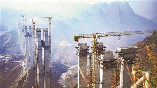 这是纳晴高速六枝特大桥施工现场(2月1日摄)。春节过后,贵州省全力推进重大项目复工复产,按下项目建设“加速键”。通过加强项目建设要素保障、补链延链强链等举措,贵州省确保2023年推进实施重大项目4000个以上,完成投资8000亿元,为新的一年高质量发展蓄势赋能。