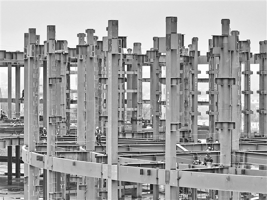 2月5日,江西省赣州市南康区家居小镇,工人在进行装配式建筑的钢结构焊装和混凝土浇筑作业。近年来,江西省赣州市把发展装配式建筑作为建筑产业转型升级的新抓手,推广运用装配式混凝土建筑、装配式钢结构建筑和装配式木结构建筑。其中,投入使用的环保节能高层商业体、住宅、展馆等钢结构装配式建筑项目占地面积达40多万平方米。朱海鹏 摄/人民图片