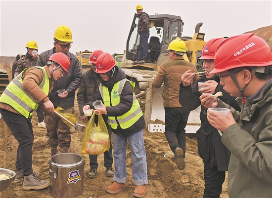 2月5日元宵节,湖北碾盘山水利水电枢纽工程左岸连接土坝建设工地上,推土机、挖掘机、运输车穿梭忙碌。正午时分,项目部把煮熟的汤圆用保温桶送到工地,让工人们也尝到元宵节的味道。施工队队长解吉军高兴地说:“这热乎乎的汤圆,暖到了我们心坎上。”据中水基础局项目部副经理胡守海介绍,大年初一到十五他们都没闲着,半个月土方回填碾压4万多立方米,大坝长高4米多。李广彦 摄