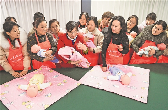 当日,来自聊城市东昌府区农村的20名家庭妇女在该培训中心参加为期12天的母婴护理、养老护理技能培训。据悉,当地家政服务机构积极开展母婴护理、养老护理、面点菜品等技能培训,帮助城乡无业、失业妇女提升就业技能,满足市场用工需求。张振祥 摄/中新社