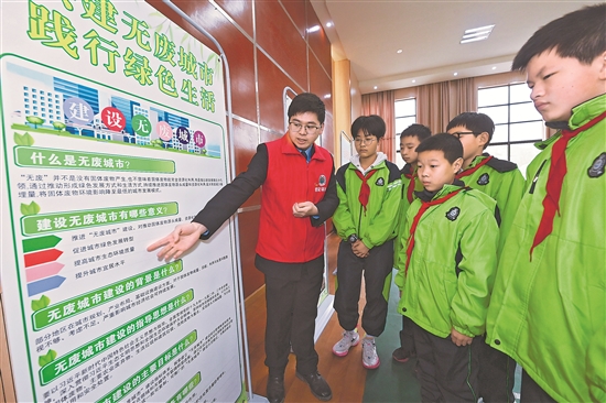 2月7日,在杭州市临安区潜川镇的潜川小学,杭州市生态环境局临安分局的党员志愿者向学生普及“无废城市”的概念。