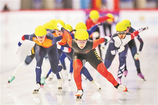 当地时间2月5日,在德国因采耳2022~2023速度滑冰青少年世界杯女子1500米比赛中,中国选手陈傲禹(前)获得冠军。