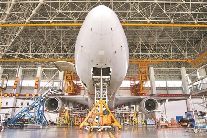 这是在海南自贸港一站式飞机维修产业基地大修机库内进行维修的香港航空空客A330飞机。