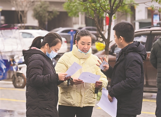 2月9日,在广西融水苗族自治县易地扶贫安置点苗美家园社区,求职者和招聘人员在交流。