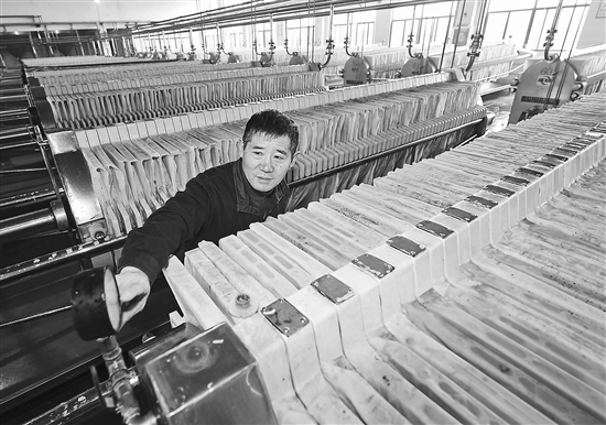 2月7日,在绍兴市越城区古越龙山酿酒一厂,酿酒师宋星雷正在车间查看进料管压力。