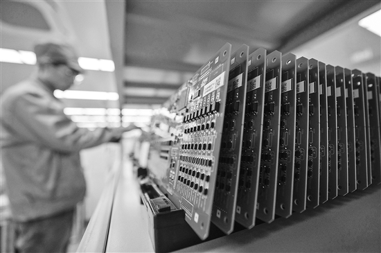 2月8日,河北沧州渤海新区黄骅市一家自动控制系统生产企业的工人在整理电路板。
