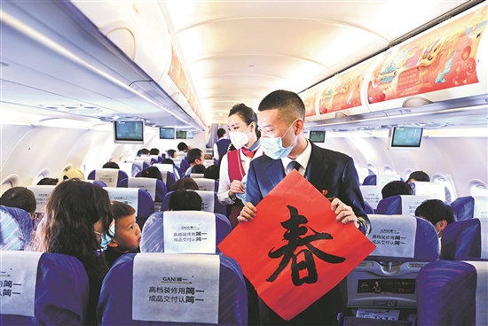 马保利在飞机上与乘客以“春”为题玩“飞花令”(2月4日摄)。