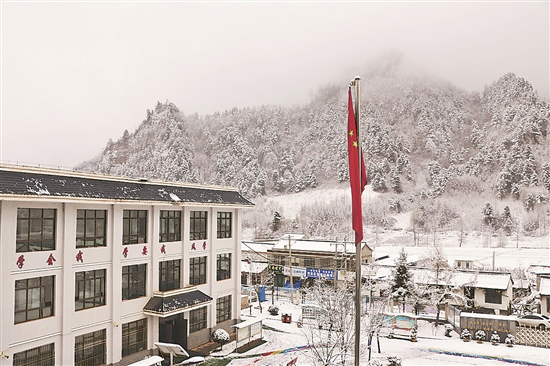 礼县县城西南40公里处,洮水河上游连绵的山峰银装素裹,松树上挂了一层新衣,一所拥有560名学生的学校坐落于1700米海拔的群山中。