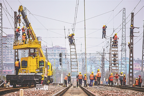 为确保铁路供电安全,鹰厦线鹰潭南站铁路枢纽“咽喉”处近日进行接触网改造施工。在施工现场,中国铁路南昌局集团有限公司鹰潭供电段一线班组接触网工犹如空中“起舞”,构成一幅以蓝天为背景的美丽画卷。 王晓颖 徐斌 摄